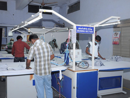The finishing area is equipped with steam ironing tables and folding table and also conveyors to reduce handling.